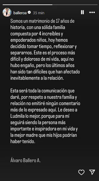 A pocos días de su separación, Álvaro Ballero compartió una sentida reflexión sobre su vida actual alejado de su ahora exesposa.