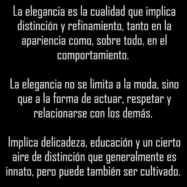 “La elegancia no se limita a la moda, sino que es la forma de actuar, respetar y relacionarse con los demás. Implica delicadeza, educación y un cierto aire de distinción que, generalmente, es innato, pero también puede ser cultivado”.