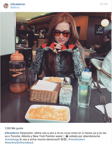 “Depresión: ultima vez q veo a mi ex rucia como en 2 meses ya q se me va a Toronto, Atlanta y New York Fashion week. odiada por abandonarme @vestalugg te voy a echar mucho demenos!!! #heartbroken#IwantmyGirlfriendback” (sic).