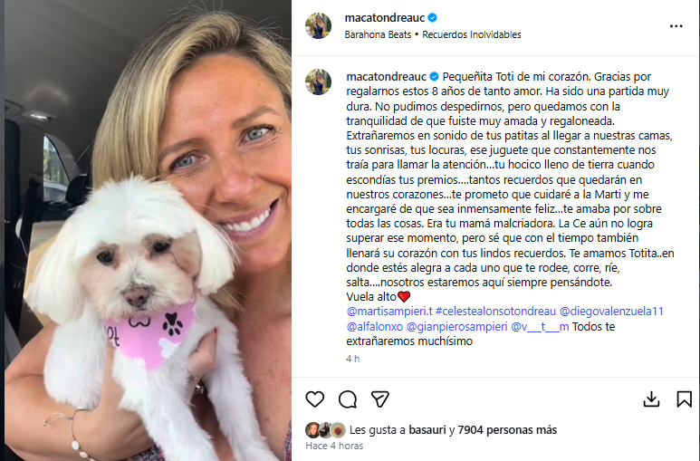Finalmente, Macarena expresó sus sentir en torno a la partida de su mascota. “Te amamos Totita. En donde estés, alegra a cada uno que te rodee, corre, ríe, salta, nosotros estaremos aquí siempre pensándote. Vuela alto”, cerró.