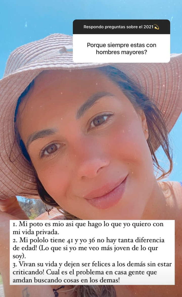 “Mi poto es mío, así que hago lo que yo quiero con mi vida privada. (Además) Mi pololo tiene 41 años y yo 36. ¡No hay tanta diferencia de edad! (Lo que sí, yo me veo más joven de lo que soy)”, aseveró.