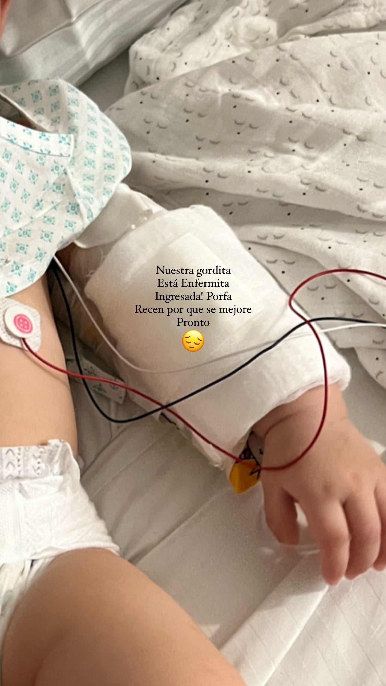 “Nuestra gordita está enfermita ingresada. Porfa recen para que se mejore pronto”, escribió sobre una imagen del brazo de la bebé.