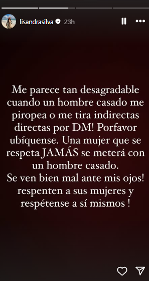 “Me Parece tan desagradable cuando un hombre casado me piropea o me tira indirectas por DM”, lanzó en un escrito en sus historias de Instagram.