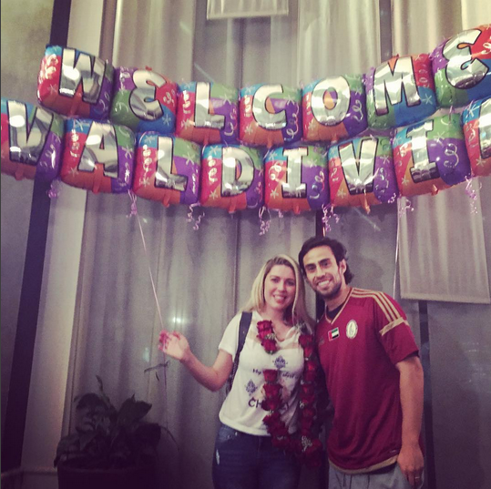En su arribo a suelo árabe, Daniela Aránguiz y Jorge tuvieron una tremenda bienvenida con ramos y collares de flores y una vistosa manga de globos con el mensaje “Bienvenido Valdivia”, entre otros presentes..