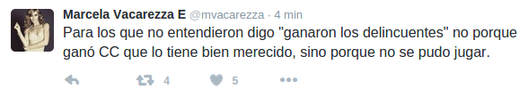 Esta publicación hizo que muchos colocolinos interpretaran que la blonda los estaba tratando de delincuentes sólo por seguir a un equipo determinado. De hecho Vacarezza respondió uno de los tuit para aclarar el asunto.