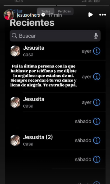 La joven actriz publicó un pantallazo del celular de su padre, evidenciando que fue la última persona con la que habló antes de su partida.