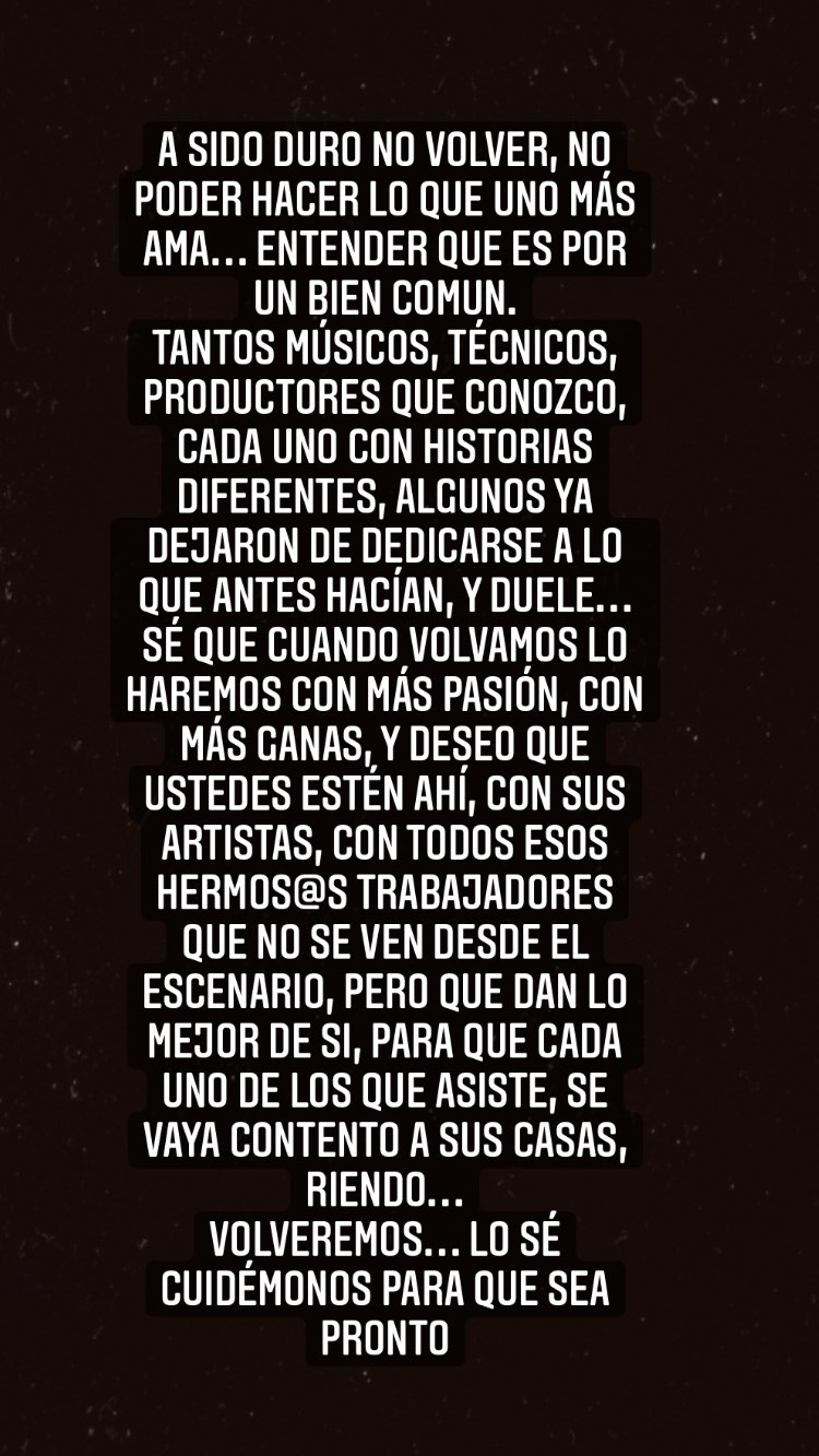 Y añadió: “Tantos músicos, técnicos, productores que conozco, cada uno con historias diferentes. Algunos ya dejaron de dedicarse a lo que antes hacían y duele”.