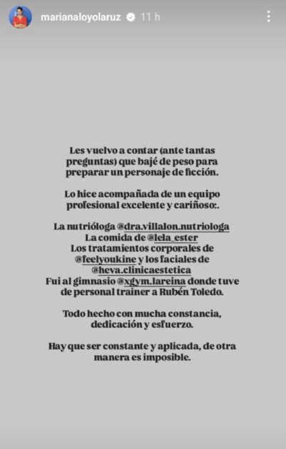 A través de redes sociales, la actriz Mariana Loyola despejó las dudas de sus seguidores y explicó los motivos detrás de su considerable baja de peso.