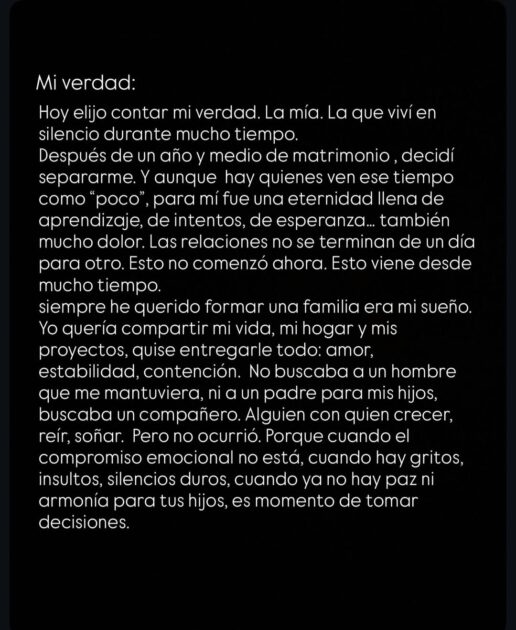 Acto seguido, aclaró: “Después de un año y medio de matrimonio, decidí separarme. Y, aunque hay quienes ven ese tiempo como poco, para mí fue una eternidad llena de aprendizaje, de intentos, de esperanza… también de mucho dolor”.