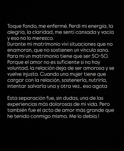Esta separación fue, sin dudas, una de las experiencias más dolorosas de mi vida. Pero también fue el acto de amor más grande que he tenido conmigo misma. Me lo debía”, dijo.