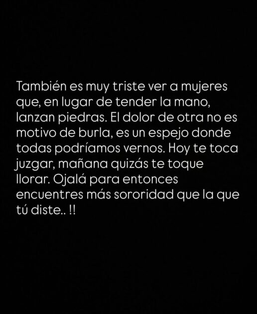 “También es muy triste ver a mujeres que, en lugar de tender la mano, lanzan piedras. El dolor de otra no es motivo de burlas, es un espejo donde todas podríamos vernos”, indicó.