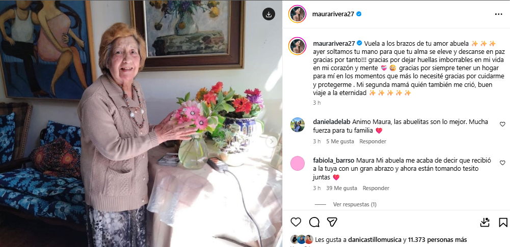 Maura Rivera evidenció su tristeza en las redes sociales, dedicando un sentido escrito a su familiar. “Vuela a los brazos de tu amor, abuela. Ayer soltamos tu mano para que tu alma se eleve y descanse en paz”, partió señalando.