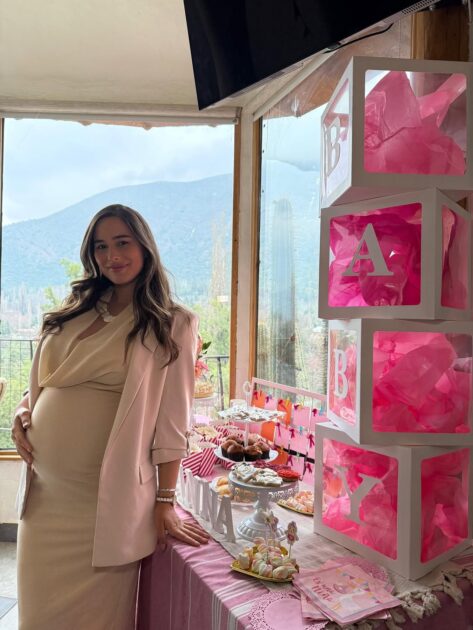Según compartió en sus historias de Instagram, las decoraciones incluían una mesa de dulces de color rosa, con el nombre de su hija en letras blancas de madera.