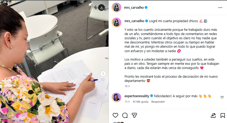 “Logré mi cuarta propiedad, chicos”, escribió junto a las postales donde en una aparece firmando, mientras que en la otra, mostrando parte de su nuevo departamento.