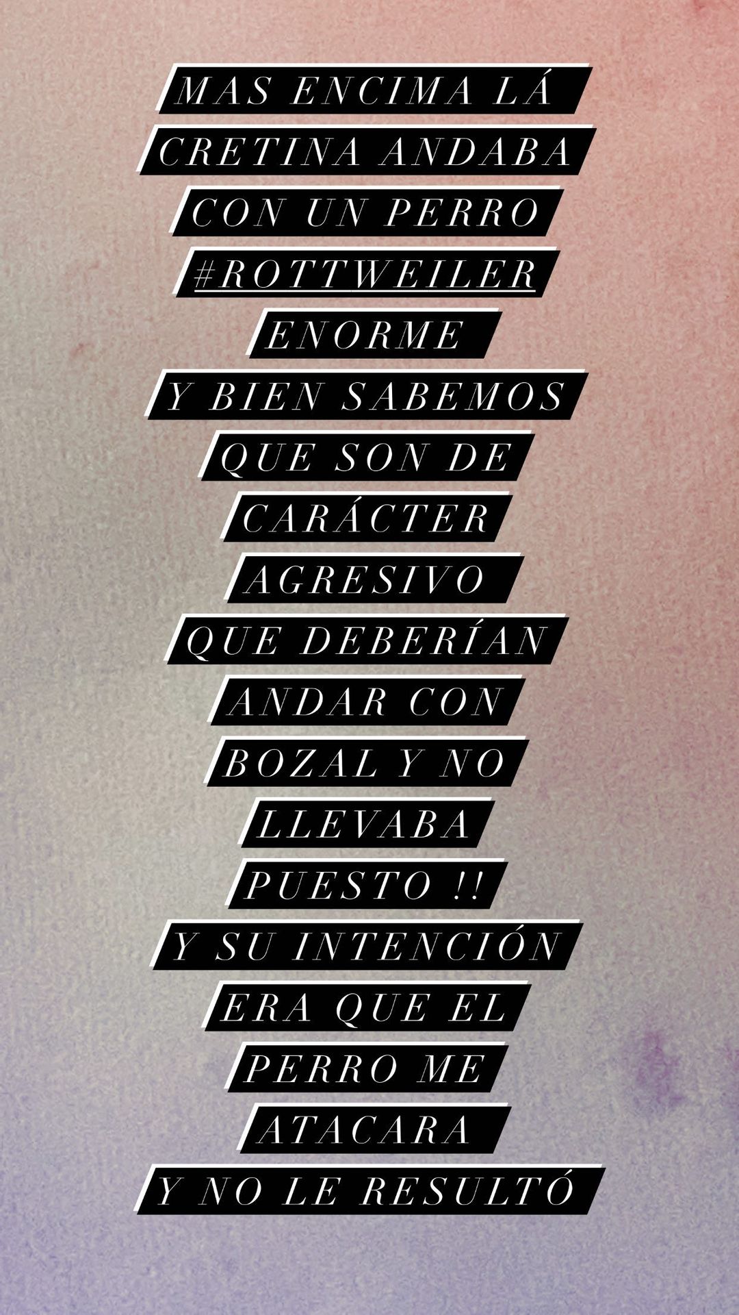 “Más encima la cretina andaba con un perro enorme y bien sabemos que son de carácter agresivo, que deberían andar con bozal y no lo llevaba puesto. Su intención era que el perro me atacara y no le resultó”, concluyó.