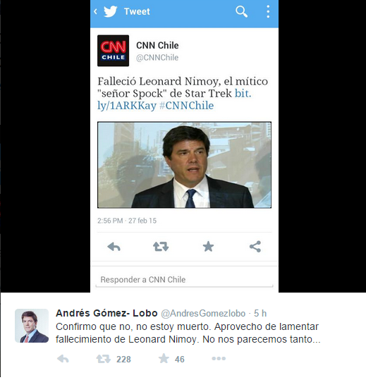 “Confirmo que no, no estoy muerto. Aprovecho de lamentar fallecimiento de Leonard Nimoy. No nos parecemos tanto…“, fueron las palabras con las que la autoridad aclaró el error.