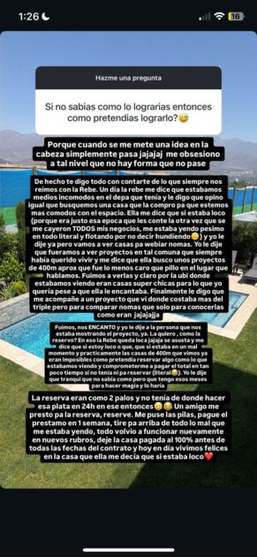 “En eso, la Rebe queda loca, se asusta y me dice que si estoy loco o qué, que si estaba en un mal momento y que las casas de 400m que vimos ya eran imposible y que cómo pretendía reservar algo como lo que estábamos viendo y comprometerme a pagar el total en tan poco tiempo si no tenía ni para reservar”.