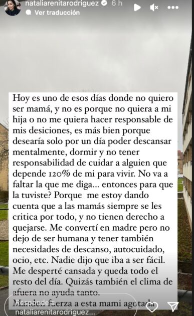 “Me convertí en madre, pero no dejo de ser humana y tener necesidades de descanso, autocuidado, ocio, etc. Nadie dijo que iba a ser fácil”, señaló.