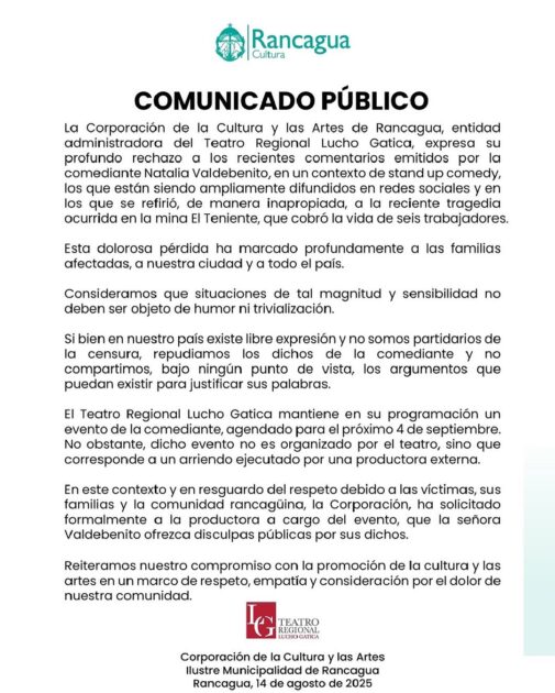 En el documento manifestaron su “profundo rechazo a los recientes comentarios emitidos por la comediante Natalia Valdebenito, en un contexto de stand up comedy, los que están siendo ampliamente difundidos en redes sociales y en los que se refirió, de manera inapropiada, a la reciente tragedia ocurrida en la mina El Teniente, que cobró la vida de seis trabajadores”.
