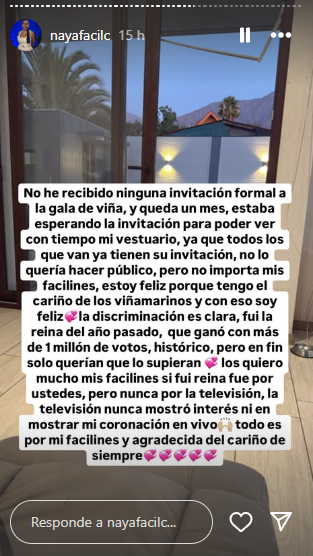 Asimismo, Naya Fácil agregó que “no es algo que quería hacer público, pero no importa mis facilines, estoy feliz porque tengo el cariño de los viñamarinos y con eso soy feliz”.
