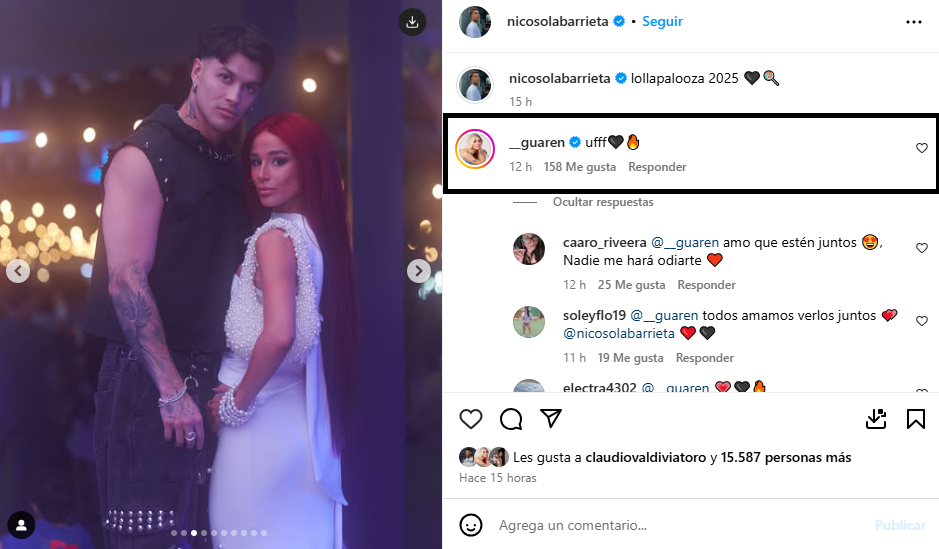 Dicho y hecho, ya que la noche de este domingo fue Guarén quien compartió un carrusel de fotos de su paso por Lollapalooza, entre ellas estaba Nico Solabarrieta.