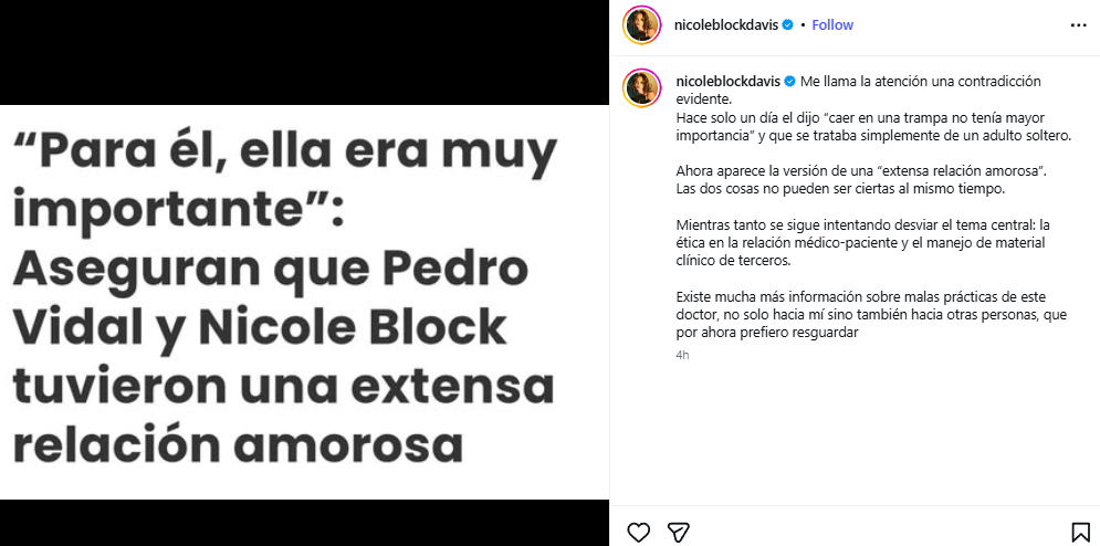 Este jueves, Nicole Block volvió a referirse al tema a través de una nueva publicación en Instagram, donde cuestionó lo que calificó como contradicciones en las versiones entregadas por el médico y su entorno.