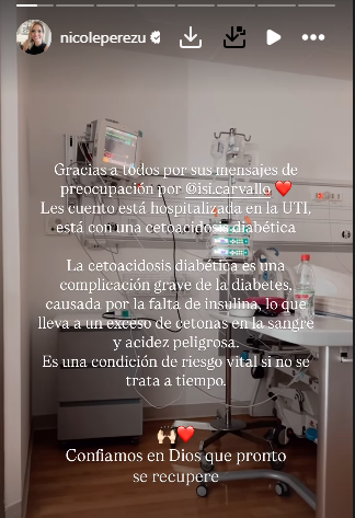 En otra historia, Nicole agradeció los mensajes de apoyo a su hija, precisando que “la Isi tiene diabetes tipo 1, que es dependiente de la insulina y tuvo una descomposición, es grave”.