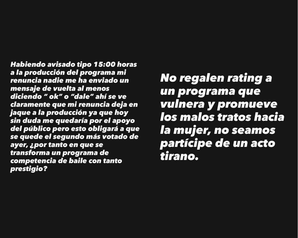“Ahí se ve claramente que mi renuncia deja en jaque a la producción, ya que hoy sin duda me quedaría por el apoyo del público, pero esto obligará a que se quede el segundo más votado de ayer. Por lo tanto, ¿en qué se transforma un programa de baile con tanto prestigio?”.