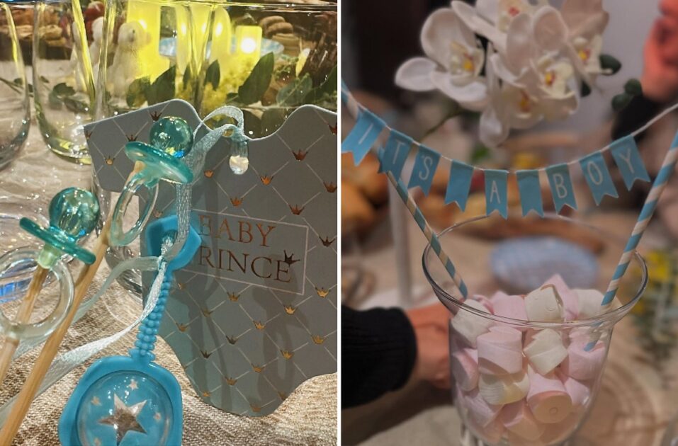 En las imágenes recientes del baby shower, se ve la decoración celeste, con banderines, ositos, sonajeros y chupetes.