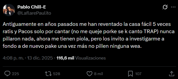 “Antiguamente en años pasados me han reventado (sic) la casa fácil 5 veces (…) solo por cantar”, escribió, agregando que en esos procedimientos “nunca pillaron nada”.