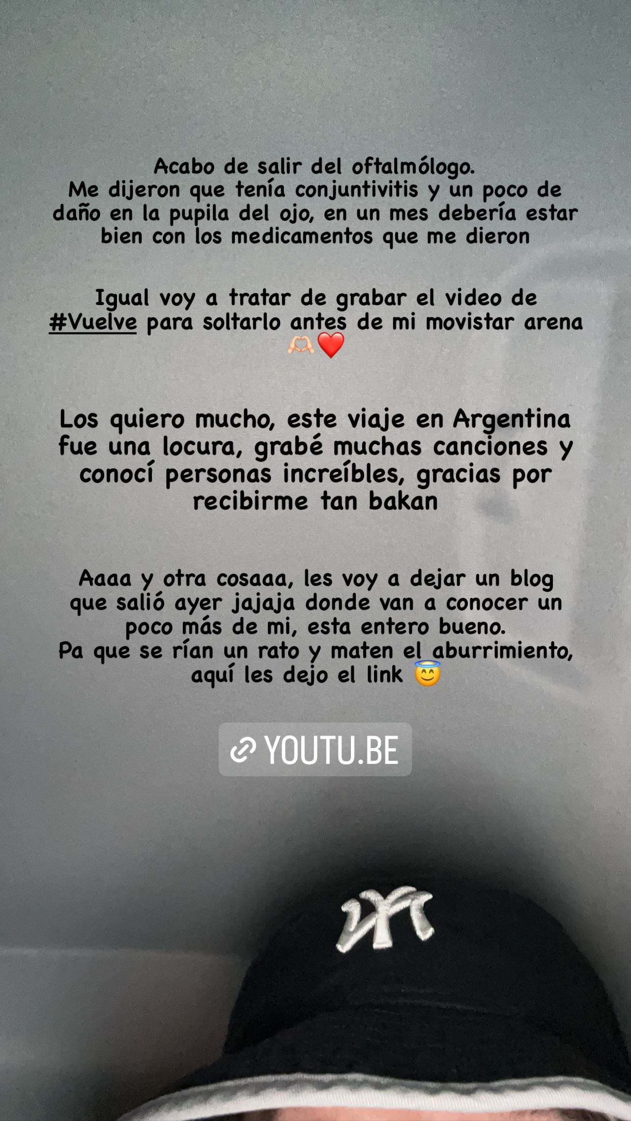 Finalmente, invitó a sus fans a ver un vblog en YouTube. “Está entero bueno. Para que se rían un rato y maten el aburrimiento”.