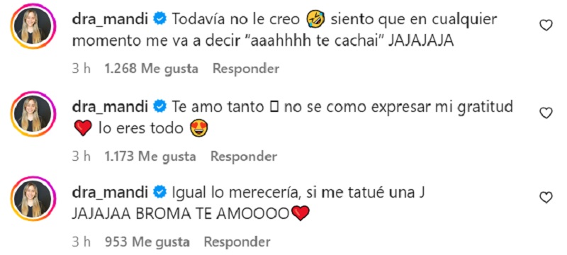 En la caja de comentarios, la pareja de Joaquín Méndez le dejó tres mensajes reaccionando al video y al regalo.
