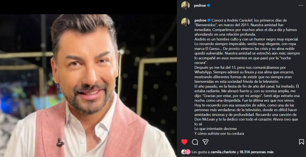 Pedro Engel usó sus redes sociales para dedicar unas íntimas palabras a Andrés Caniulef tras su repentina muerte a los 48 años.