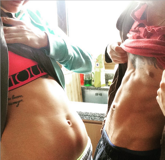 Así lo demostró con una imagen donde ambos aparecen con las poleras levantadas y mostrando sus vientres planos.