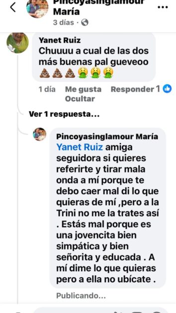 “Amiga seguidora, si quieres referirte y tirar mala onda a mí porque te debo caer mal, di lo que quieras de mí, pero a la Trini no me la trates así“, expresó la exparticipante del programa de Chilevisión.