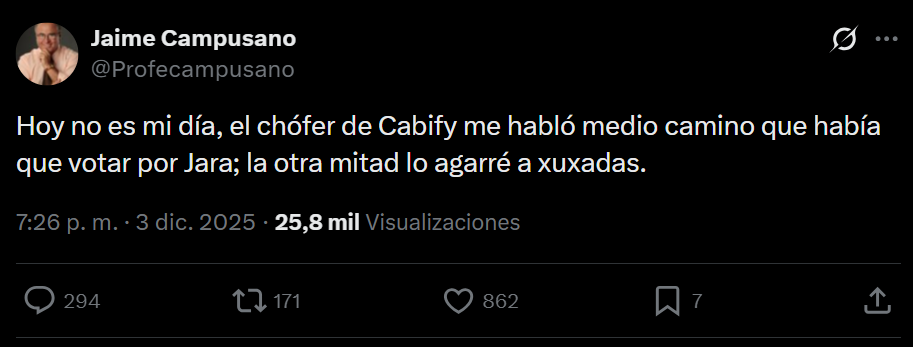 “Hoy no es mi día. El chófer de Cabify me habló medio camino que había que votar por Jara; la otra mitad lo agarré a xuxadas(sic)”, escribió.