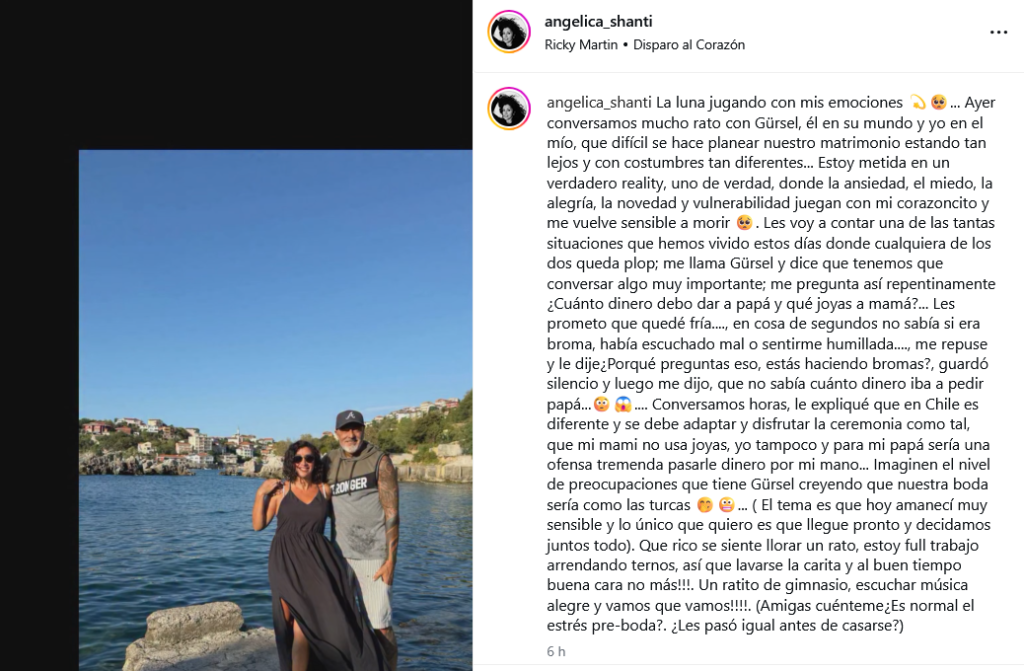 La influencer Angélica Sepúlveda compartió en Instagram una anécdota sobre su novio turco, Gürsel, en la que éste le preguntó cuánto dinero debía dar a su padre y qué joyas regalar a su madre, generando confusión en la chilena. A pesar del malentendido cultural, Angélica aclaró que en su país las tradiciones son distintas y que lo importante es disfrutar de la ceremonia. La situación revela las diferencias en costumbres entre ambos, pero la pareja busca adaptarse y tomar decisiones juntos para su boda.