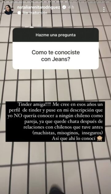 De hecho, Arenita reveló que se conocieron gracias a una aplicación de citas. “Me creé en esos años un perfil de Tinder, y puse en mi descripción que yo no quería conocer a ningún chileno como pareja”, contó en sus historias.