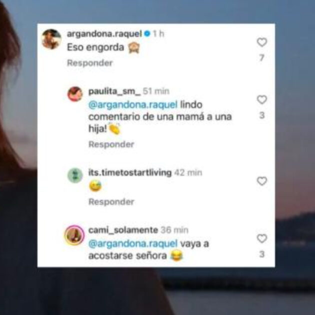 “¿Y qué importa? Ella está preciosa, puede darse el gusto. Me extraña Raca”: “Usted sea feliz comiendo, la mamá se encandila por tu brillo y luz. No deja ser feliz, ya su momento lo tuvo”; “Raquel, déjala que disfrute y sea feliz. Nada que un cirujano no pueda aspirar”; “Ella es estupenda, unos fideos más qué importa Raquel Argandoña”, fueron algunos de los escritos.