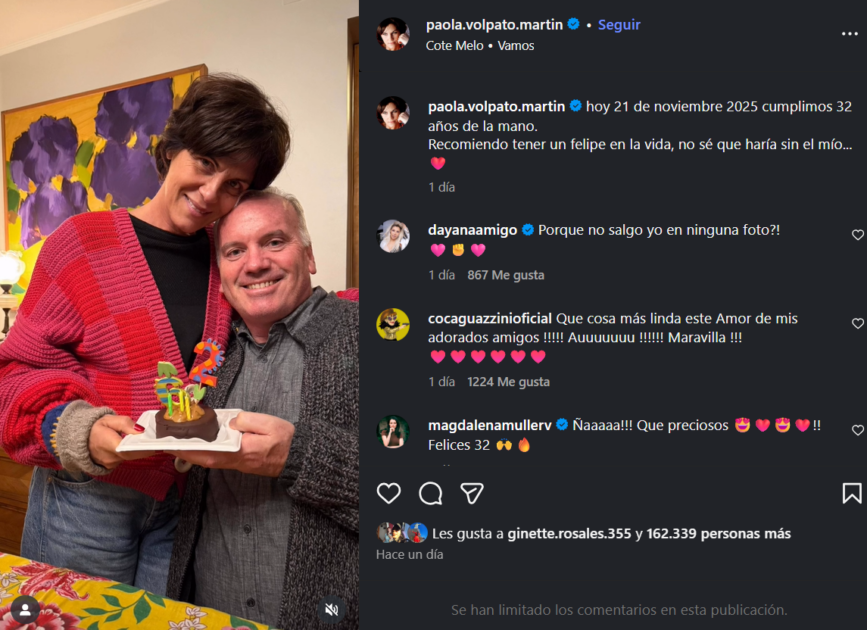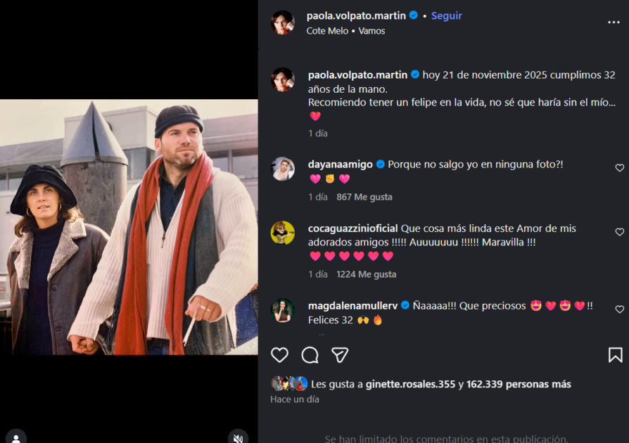 “¡Qué cosa más linda este amor de mis adorados amigos!”, escribió Coca Guazzini. “¡Qué preciosos! Felices 32”, añadió Magdalena Müller. “Gran hazaña”, se sumó María Omegna.