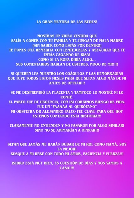 En esa línea, envió un claro mensaje: “Jamás me harán dudar de mi rol como mamá. ¡Soy la mejor! Busqué a mi bebé con todo mi amor, paciencia y fuerza. Isidro está muy bien. Es cuestión de días y nos vamos a casa”.
