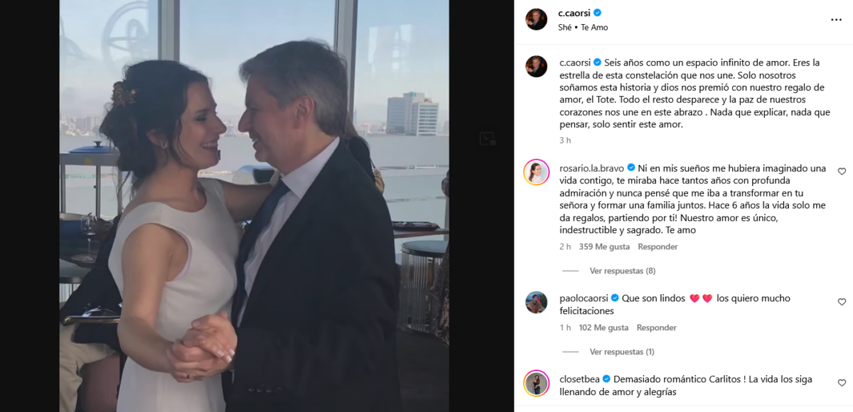 Rosario Bravo y Carlos Caorsi cumplieron seis años de matrimonio, motivo por el que se expresaron en sus respectivas redes sociales.