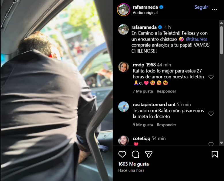 “En camino a la Teletón. Felices y con un encuentro chistoso. Tita, ¡cómprale anteojos a tu papá!”, bromeó Rafael en el video difundido en su cuenta de Instagram.