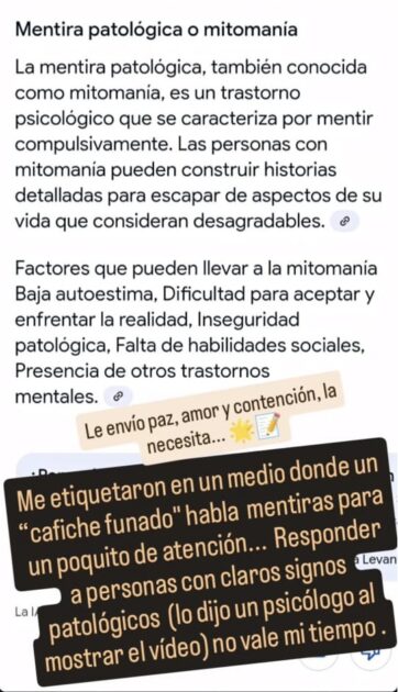 “Le envío paz, amor y contención; la necesita”, comenzó escribiendo junto a una captura que daba indicaciones sobre la mitomanía.
