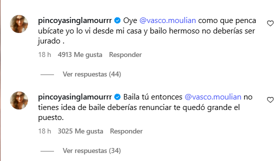 A continuación, sumó otro comentario en defensa de su amiga: “¿Cómo que penca? Ubícate. Yo lo vi desde mi casa y bailó hermoso. No deberías ser jurado”.