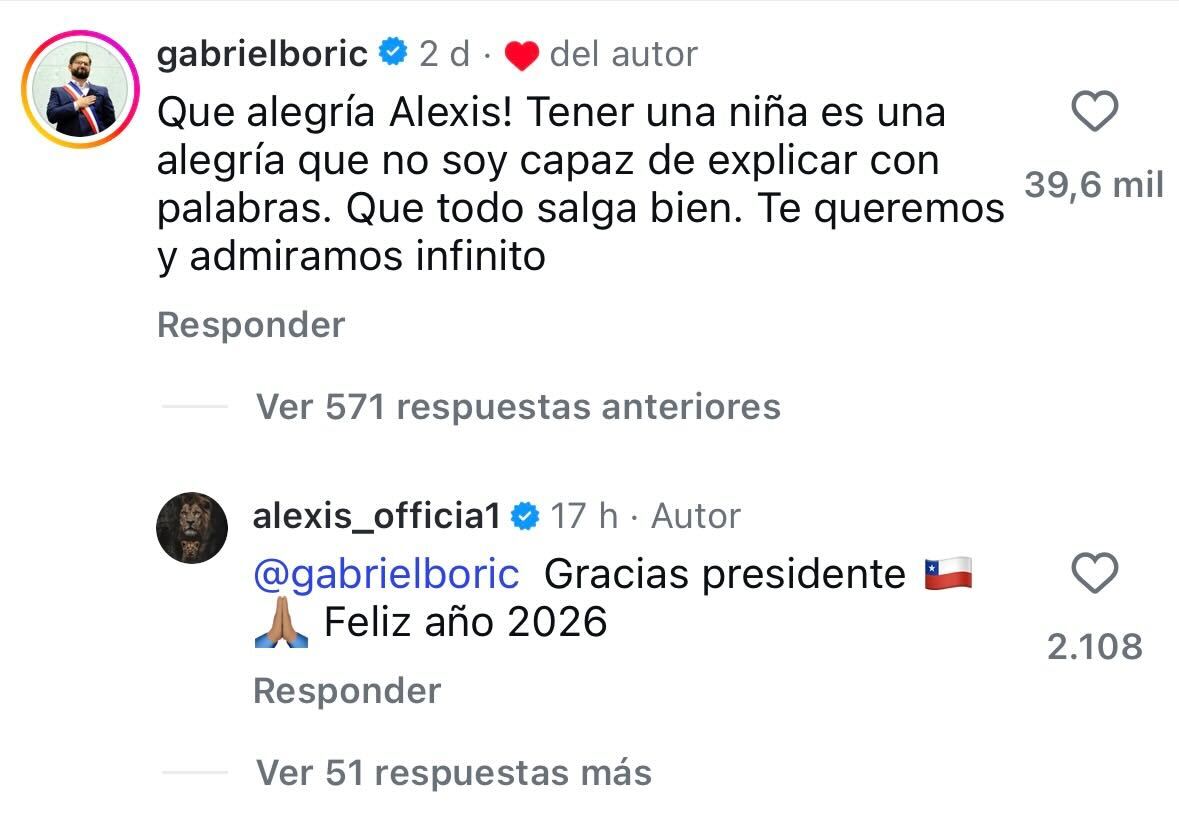 El mandatario no dudó en dejar un mensaje lleno de cariño para el futbolista. “¡Qué alegría Alexis! Tener una niña es una alegría que no soy capaz de explicar con palabras”, escribió Boric en los comentarios de la publicación.