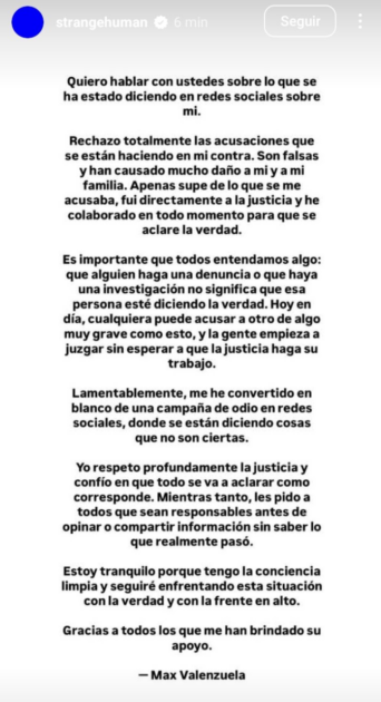 “Rechazo totalmente las acusaciones que se están haciendo en mi contra”, expresó Valenzuela mediante un comunicado publicado en su cuenta de Instagram.