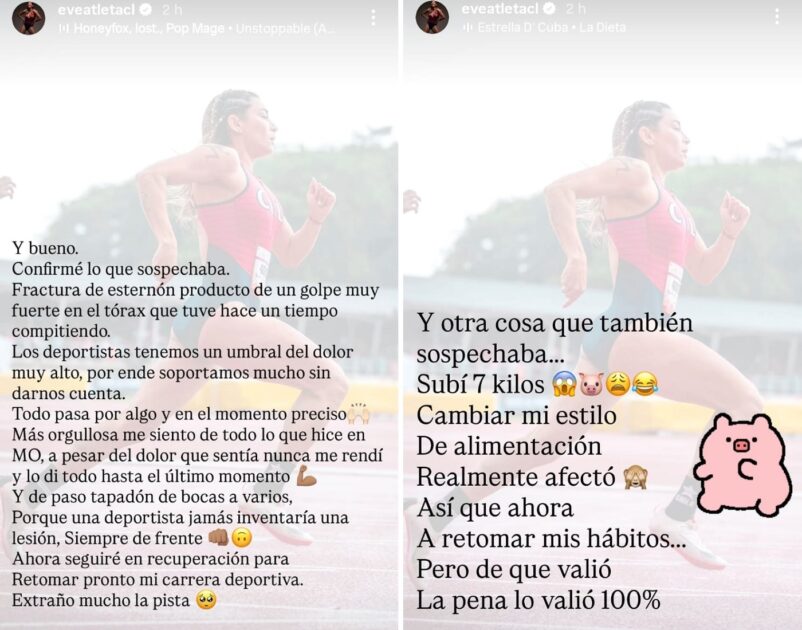 “Fractura de esternón producto de un golpe muy fuerte en el tórax que tuve hace un tiempo compitiendo”, lamentó Evelyn.