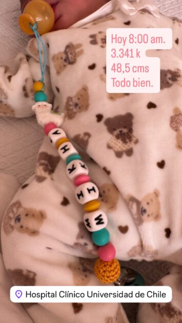 “Todo bien”, escribió Siches junto a una foto donde se alcanza a ver la recién nacida con su chupete, usando un enterito de ositos.