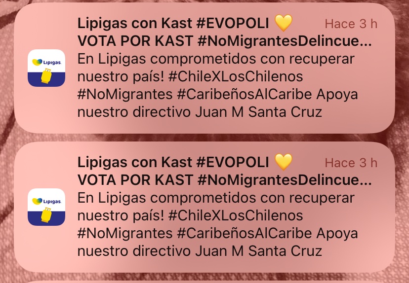 “Lipigas por Kast #Evópoli. Vota por Kast #NoMigrantesDelincuentes. En Lipigas, comprometidos con recuperar nuestro país!”, detalla el texto que comenzó a circular, de acuerdo a las imágenes compartidas por distintos usuarios.
